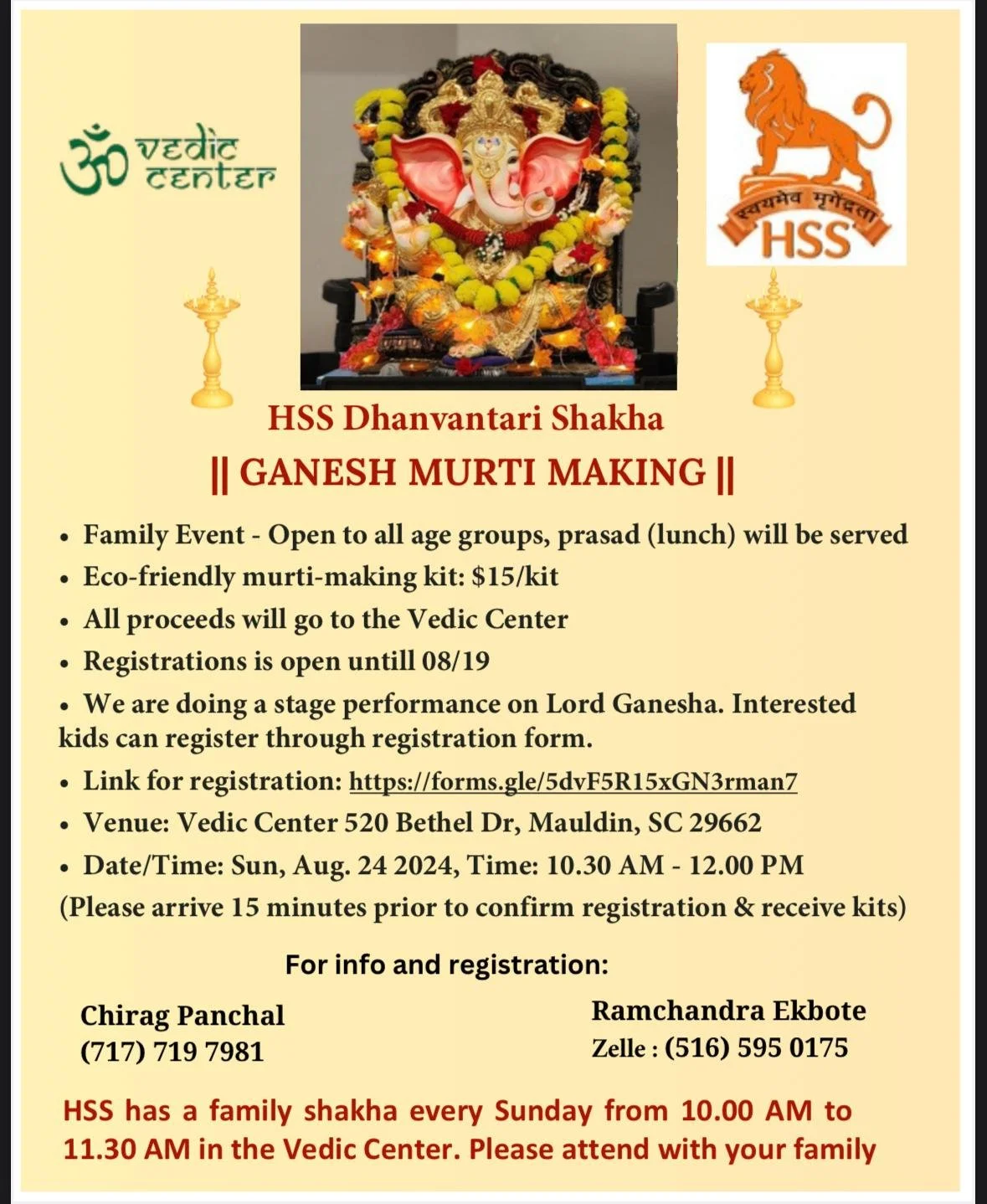 Aug 24 HSS Dhanvantari Shakha - Ganesh Murti Making Sunday, August 24, 2025 10:30 AM 12:00 PM Google Calendar ICS Murti Making Registration View Event →